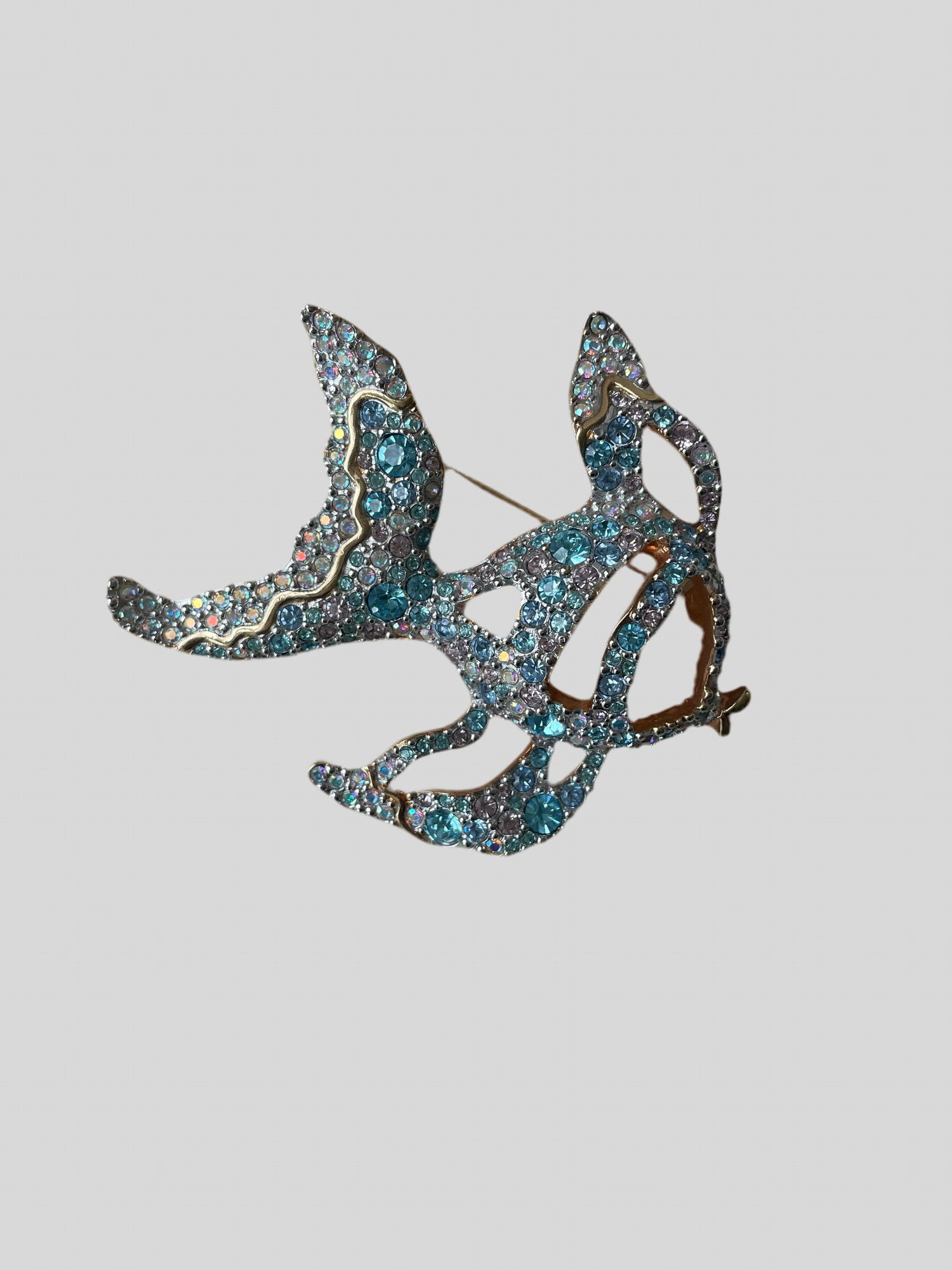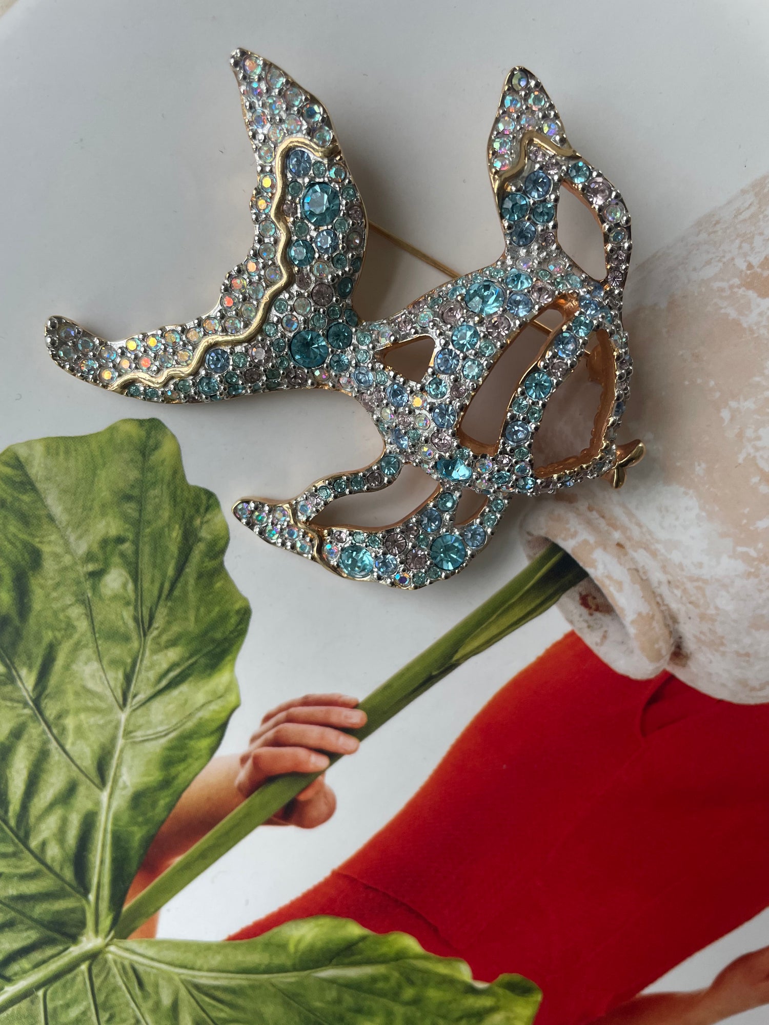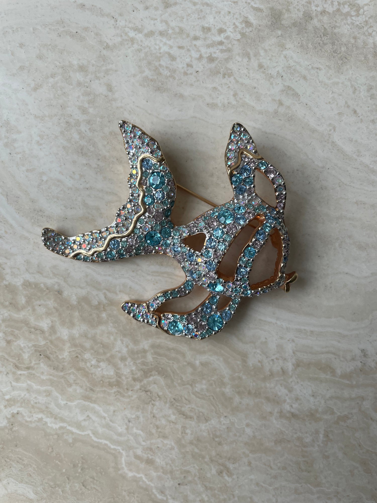 Vintage gold tone & blue Swarovski crystal pin brooch. 2.75” in length and 2.25” in widest width