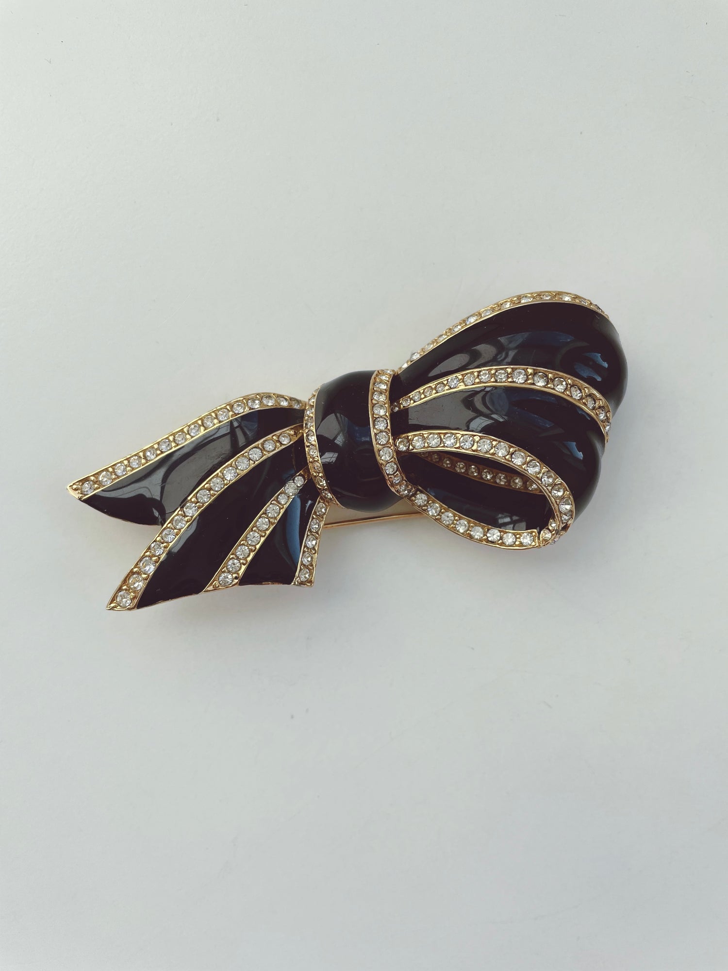 Vintage CINER signed gold tone & clear rhinestone with black enamel bow pin brooch. 3.5” in length and 1.5” in widest width