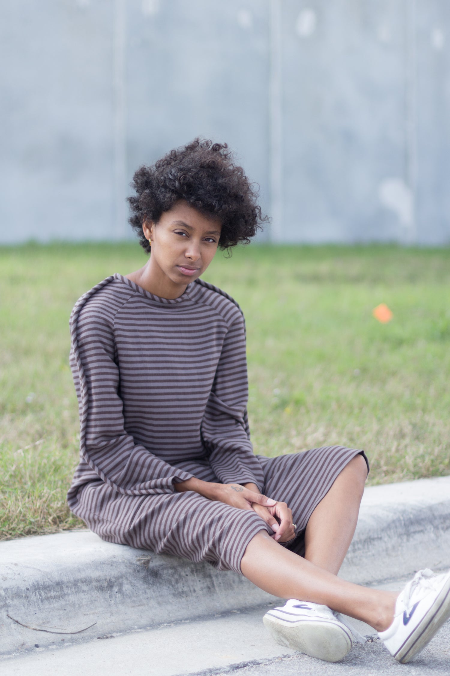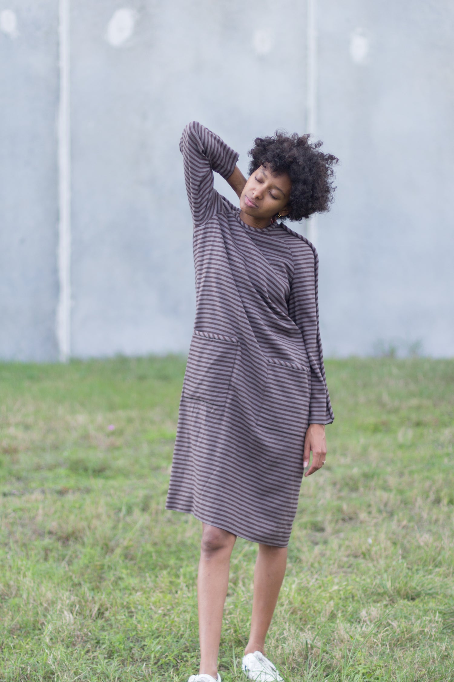 Albert Nipon striped dress. Avant-garde piping detail on neckline, sleeve, and pockets. High neckline. Wool. Fully Lined. Button back closure.