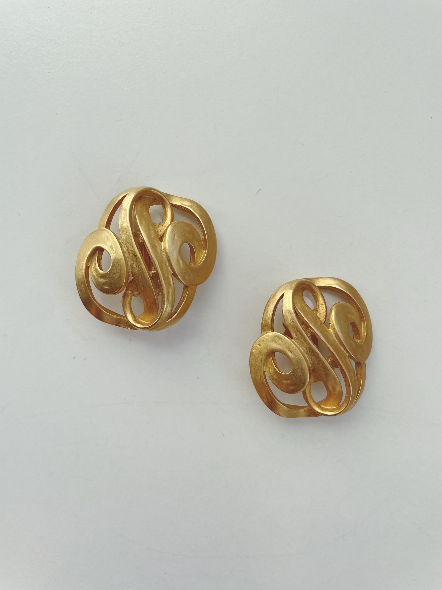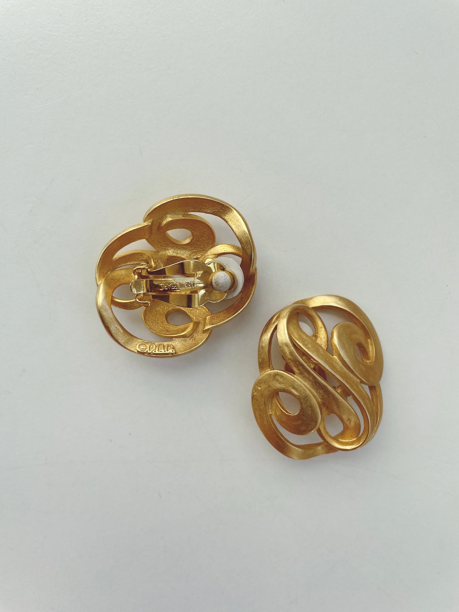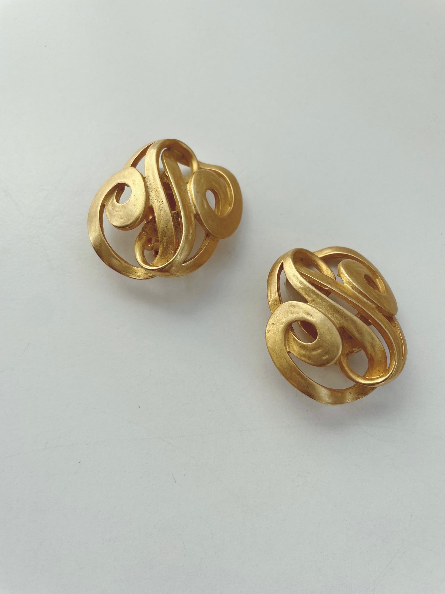 ERWIN PEARL Vintage swirl gold metal designer modernist sculptural earrings. 1.5” clip ons. Marked P.E.P Erwin Pearl