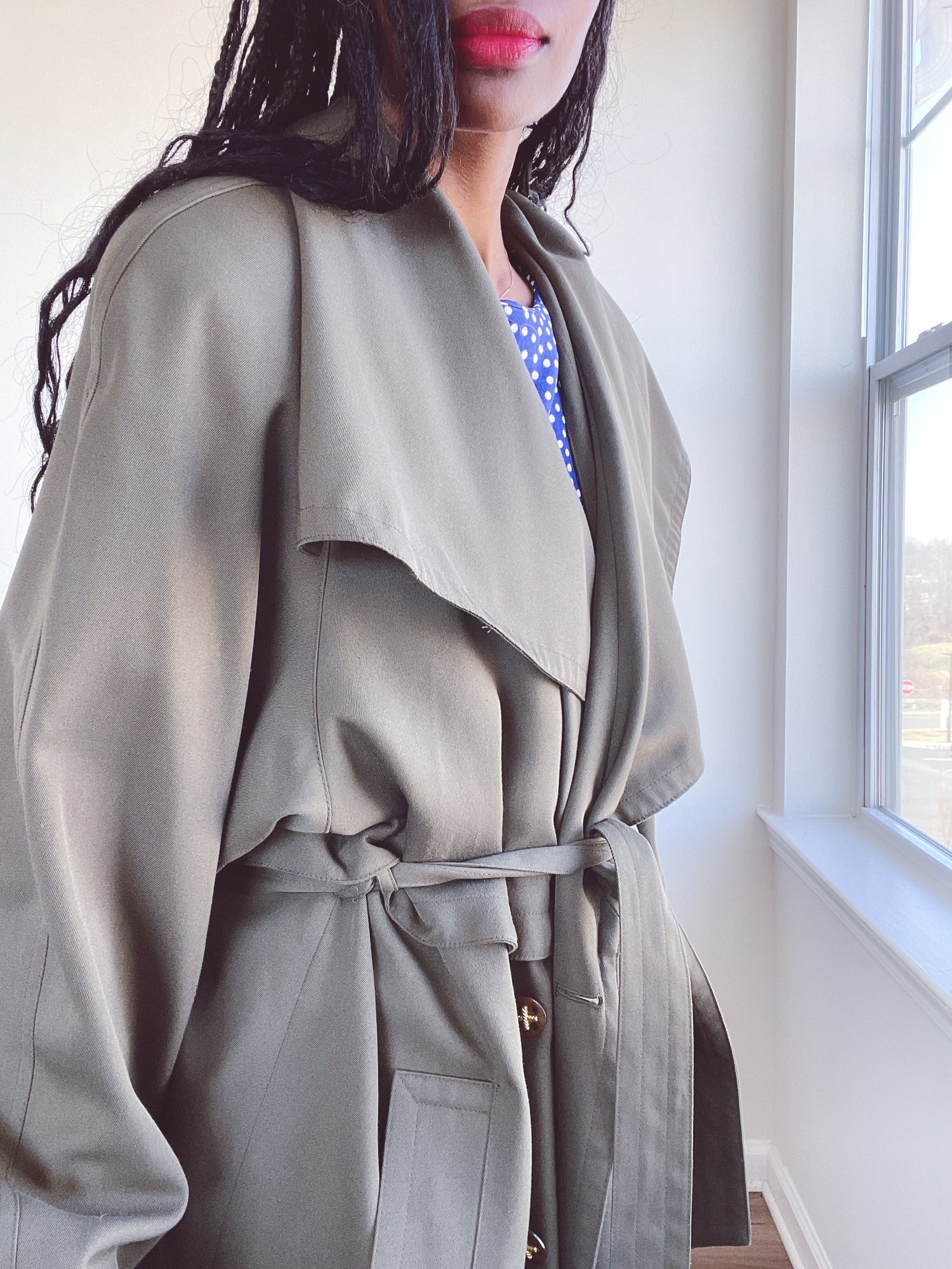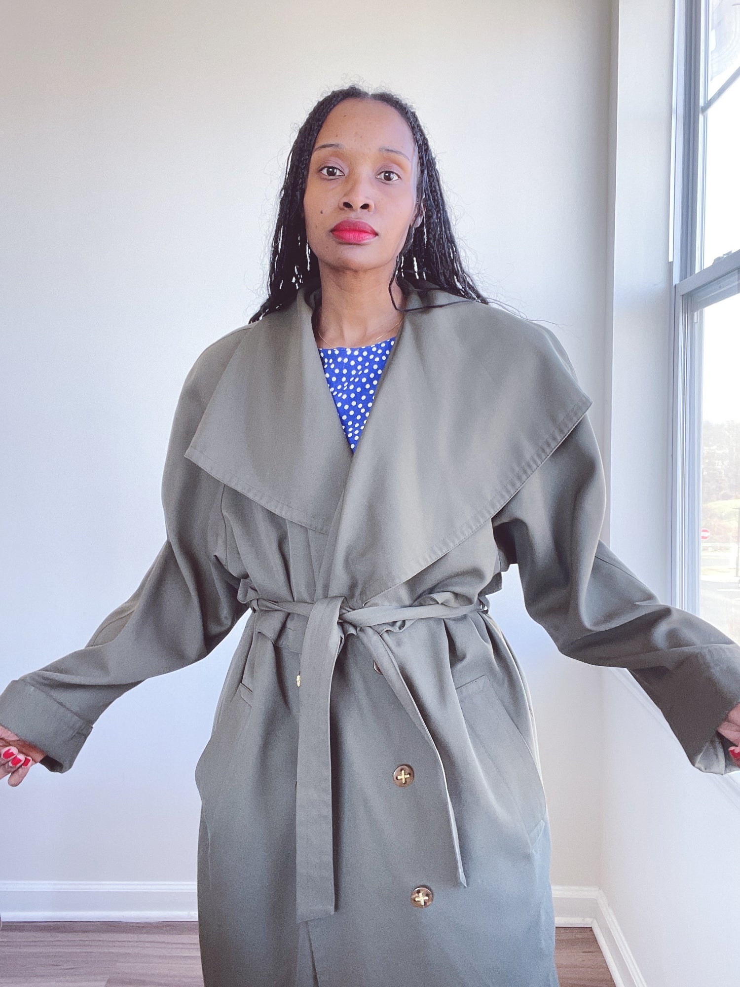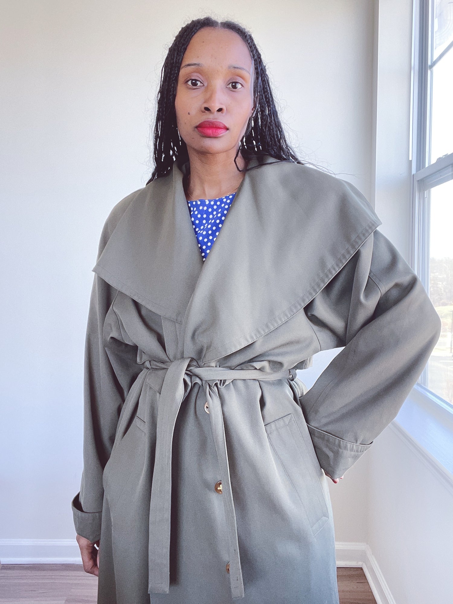 Vintage exaggerated collar olive trench coat. Liner and matching belt included. Poly rayon blend. Double breasted. Has shoulder pads but could be removed.