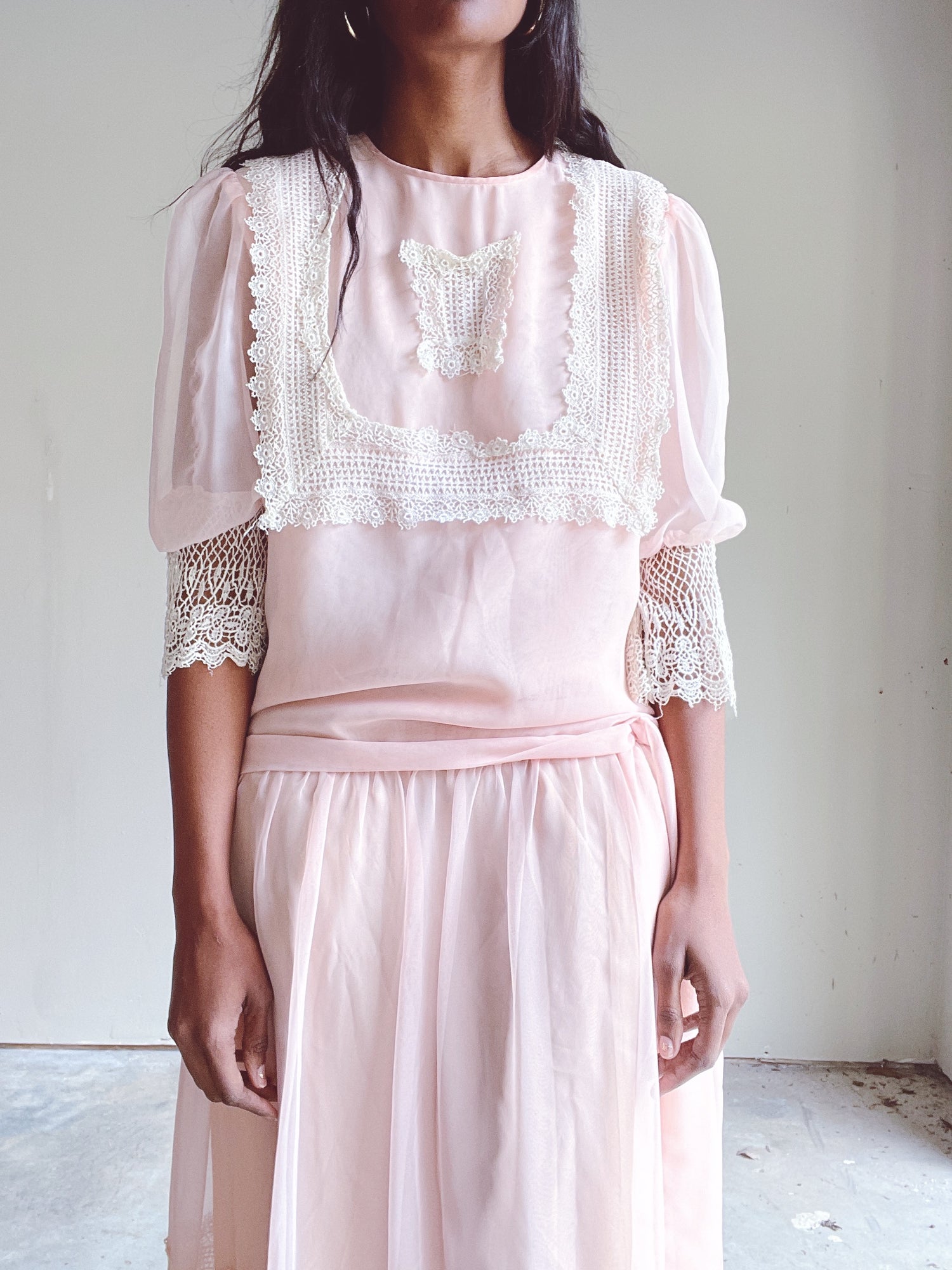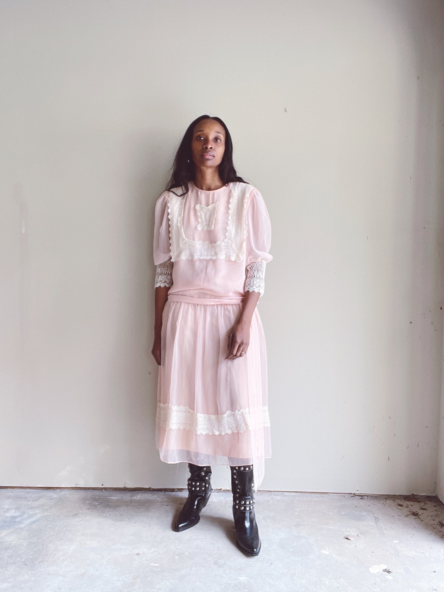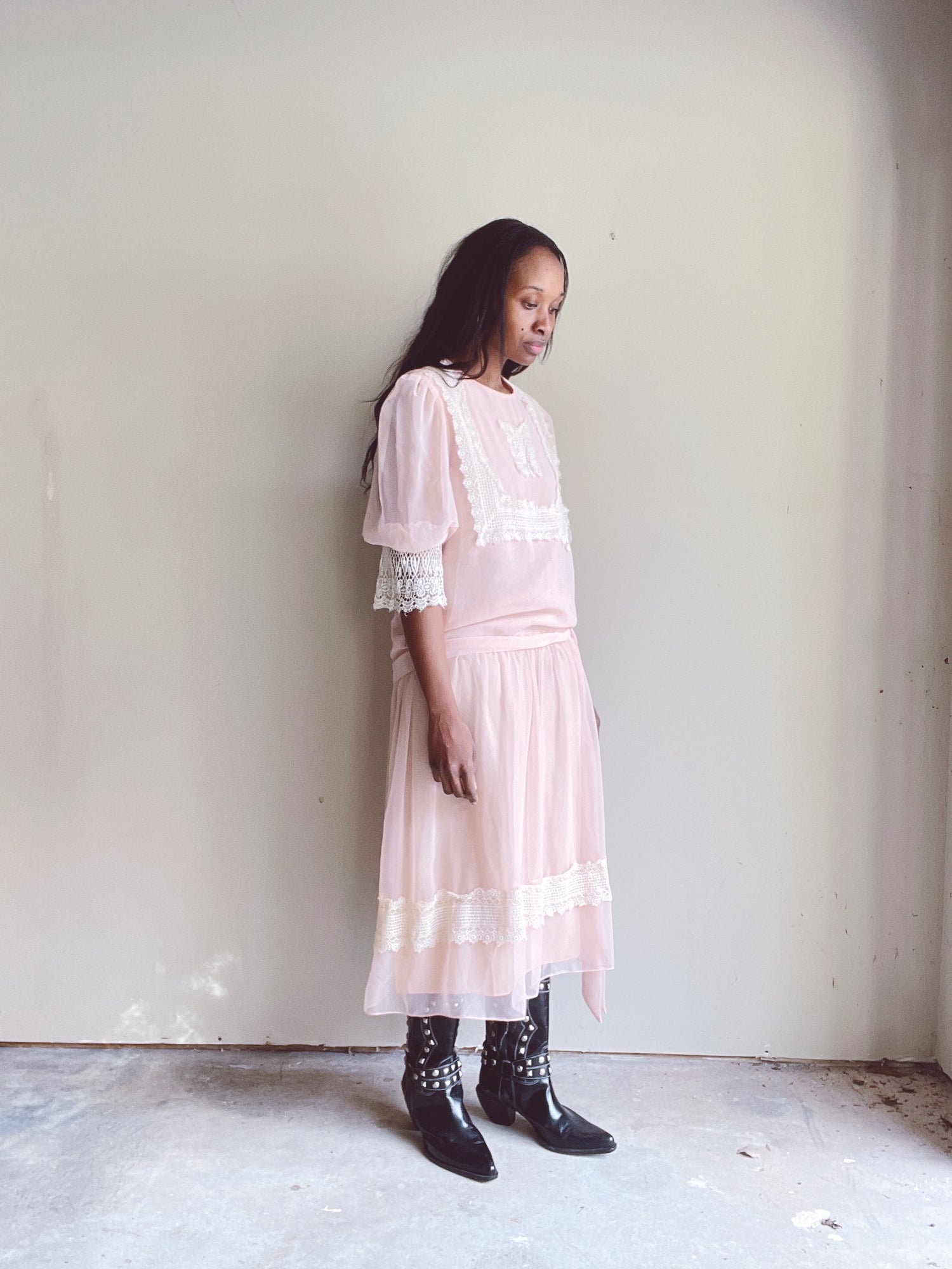 20s style remake drop waist dress. Lace smock detail on bodice, wrists and hemline. Zip and small pearl button closure down the back. Fully lined.