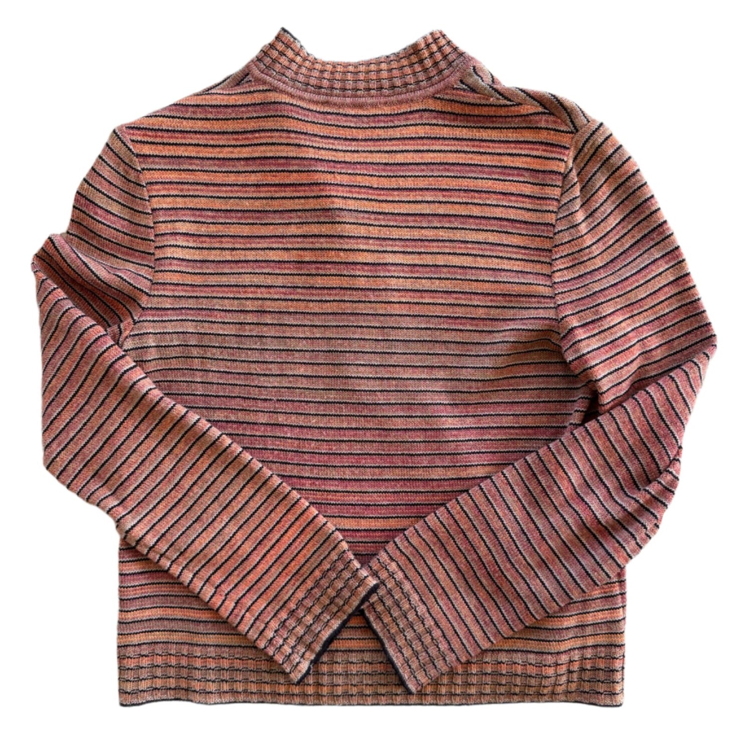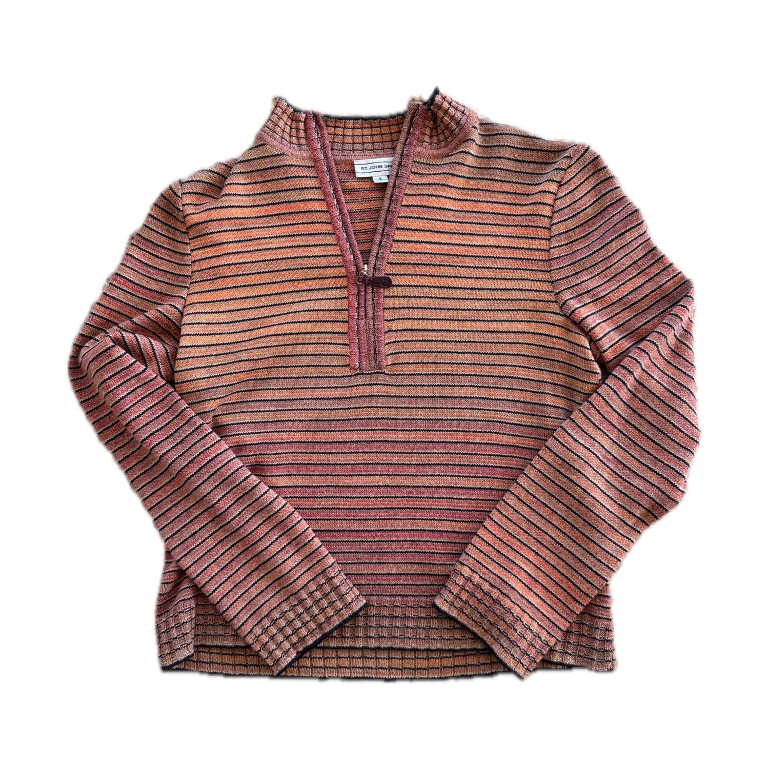 Striped sweater in orange with brown detailing. Half zip neck and long sleeves. Ideal for a sporty look.