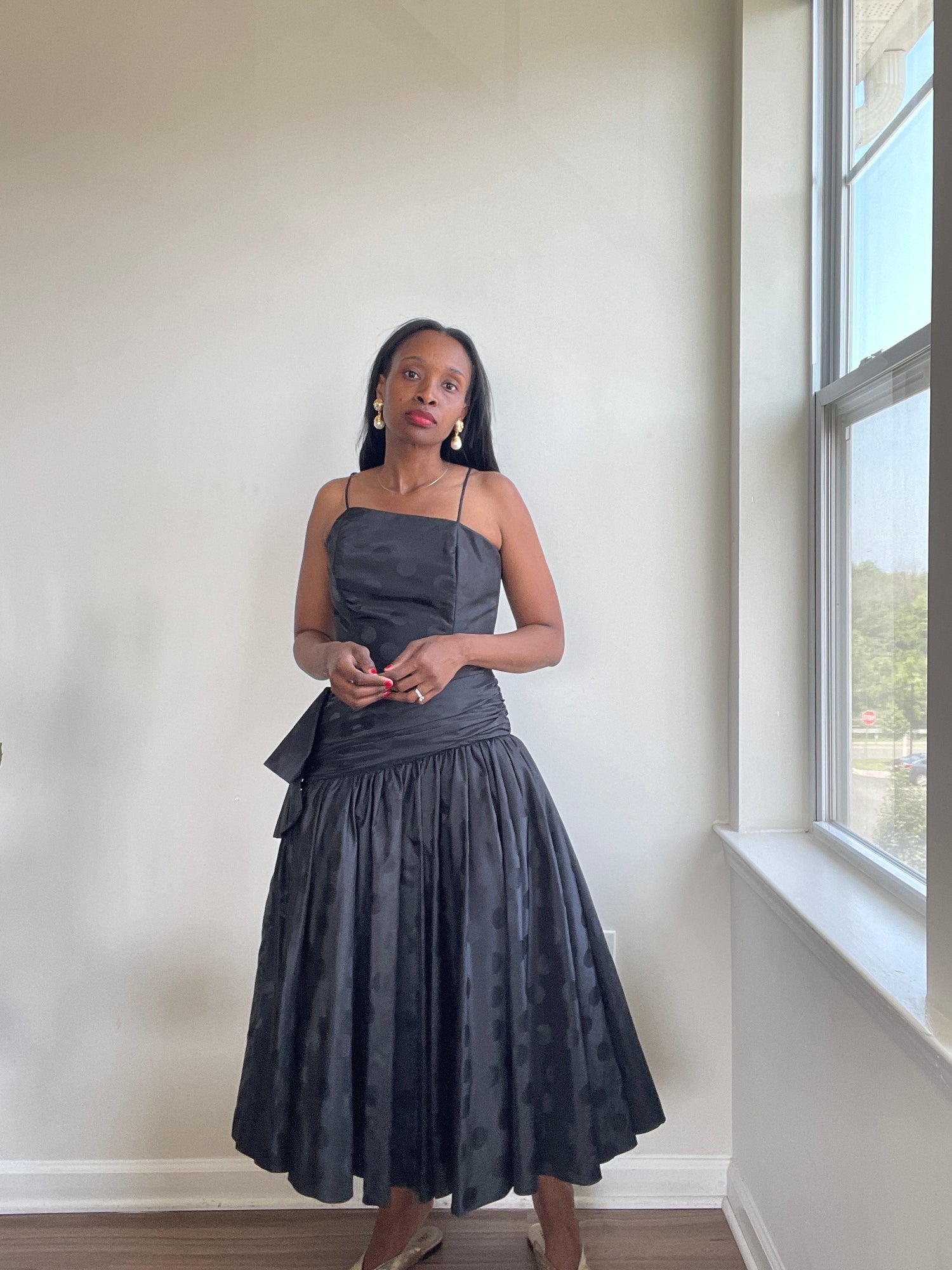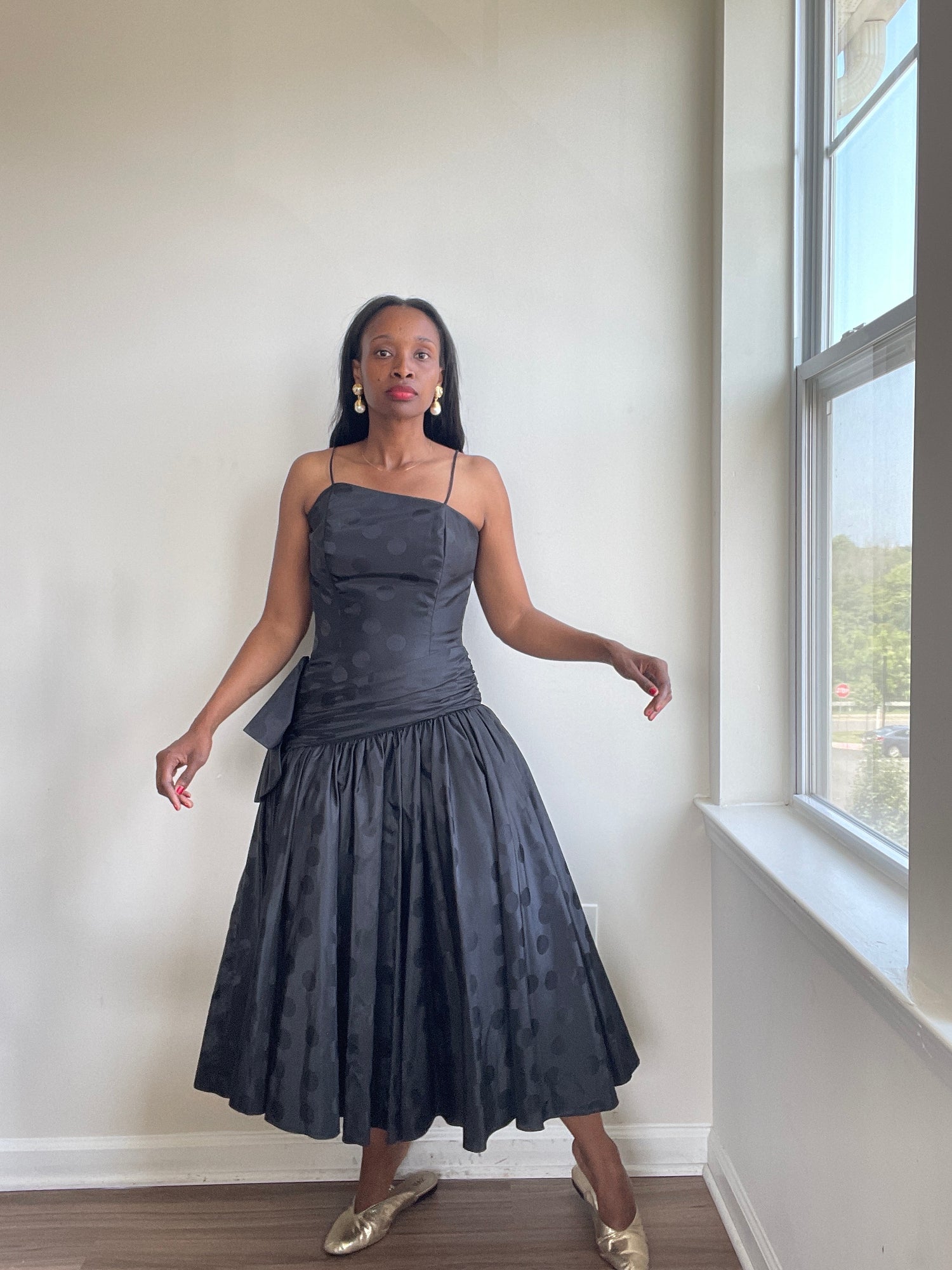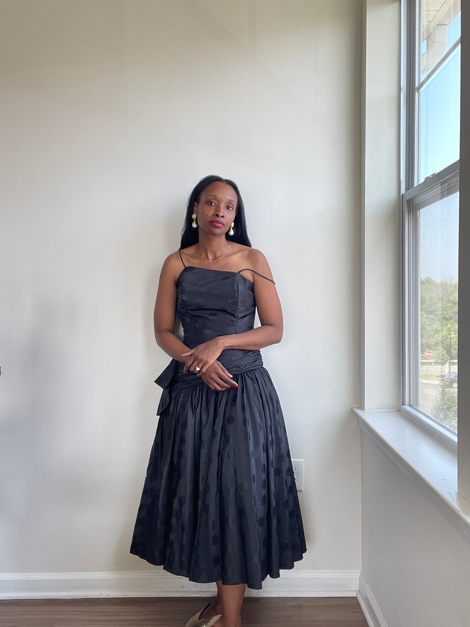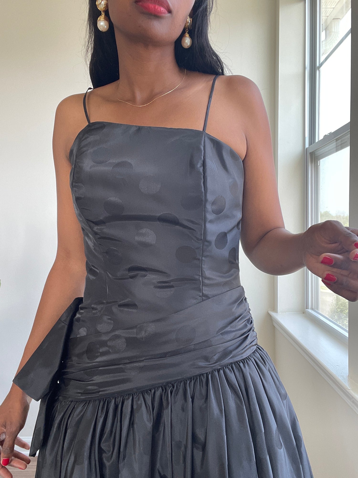 Black polka dot cocktail dress. Assymetrical. Drop waist. Bow detail.