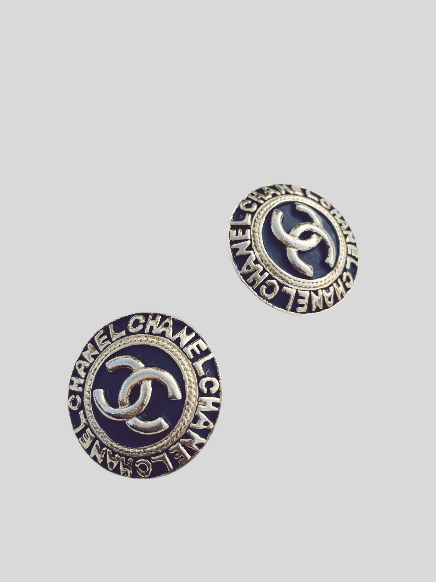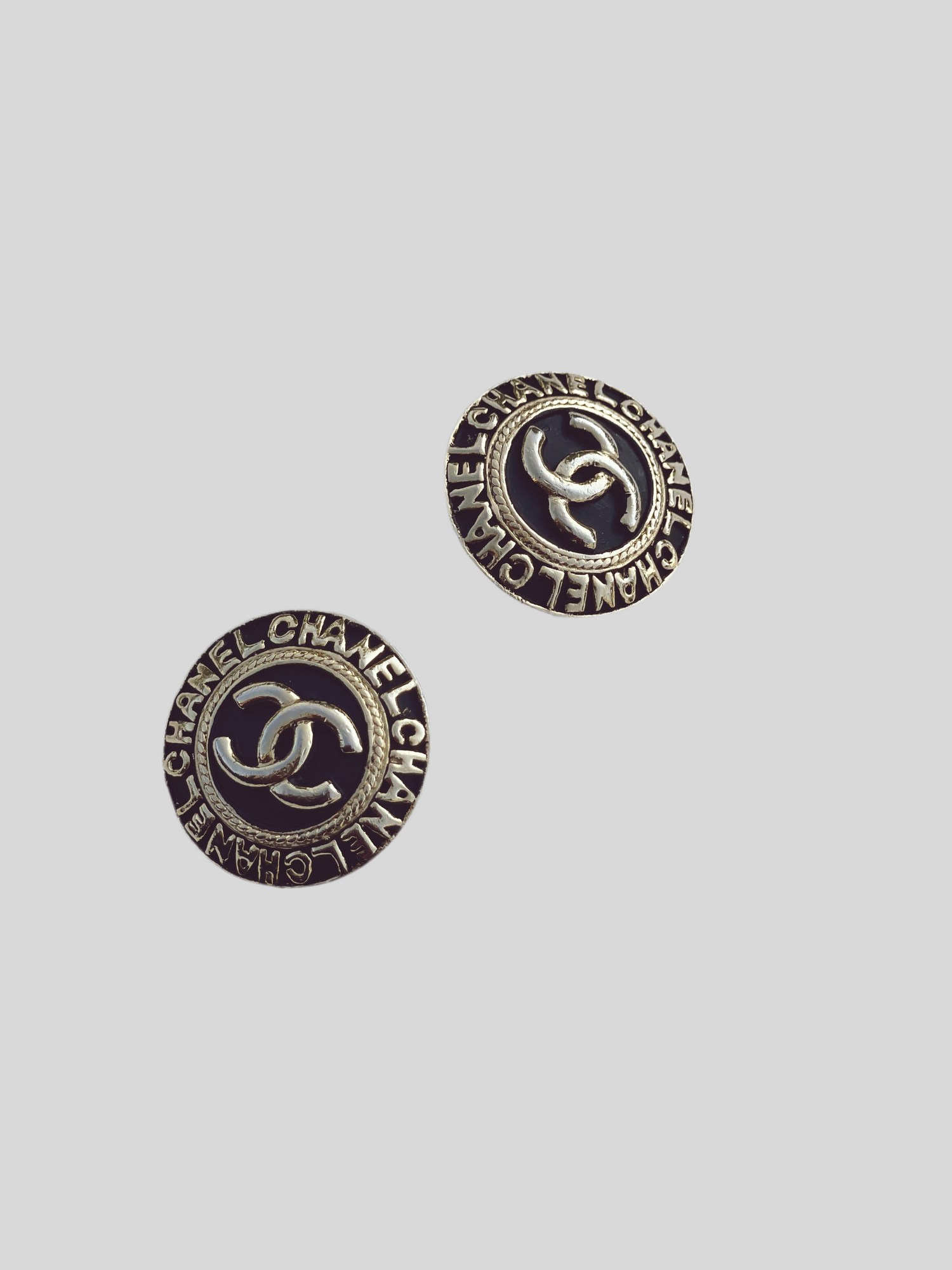 Vintage Chanel black gold tone metal clip on earrings. about 1.5” diameters.