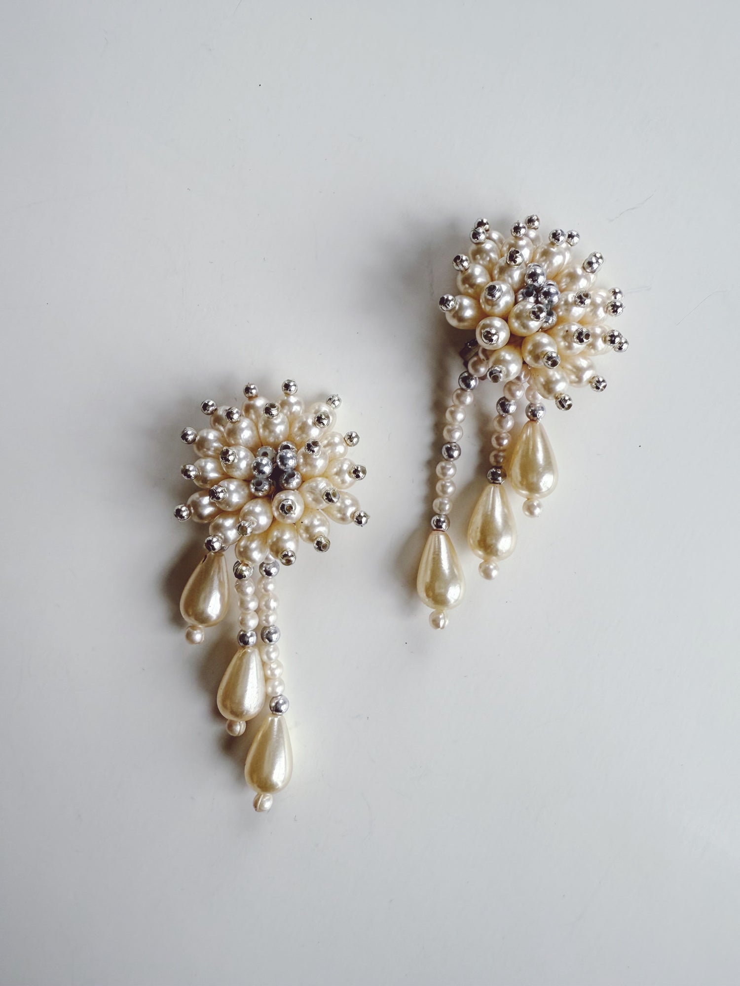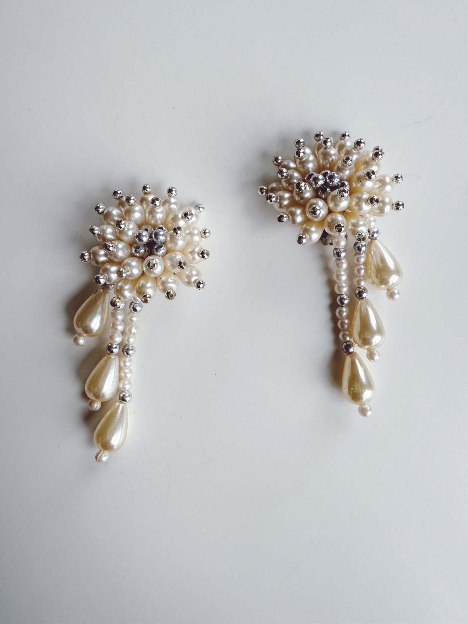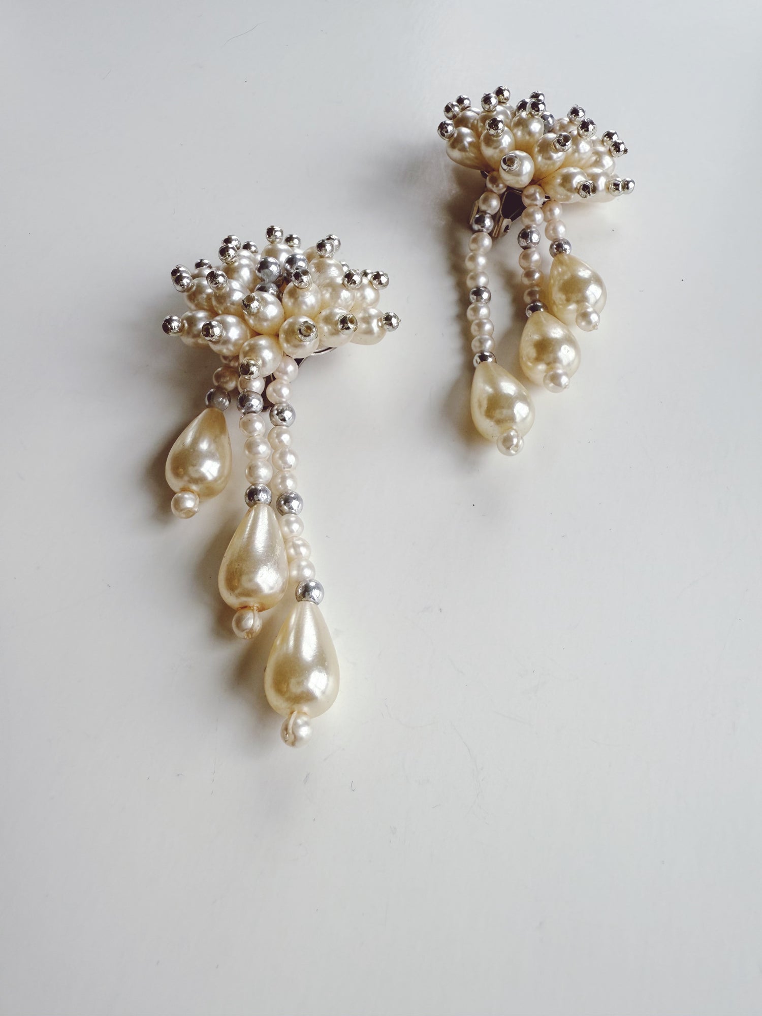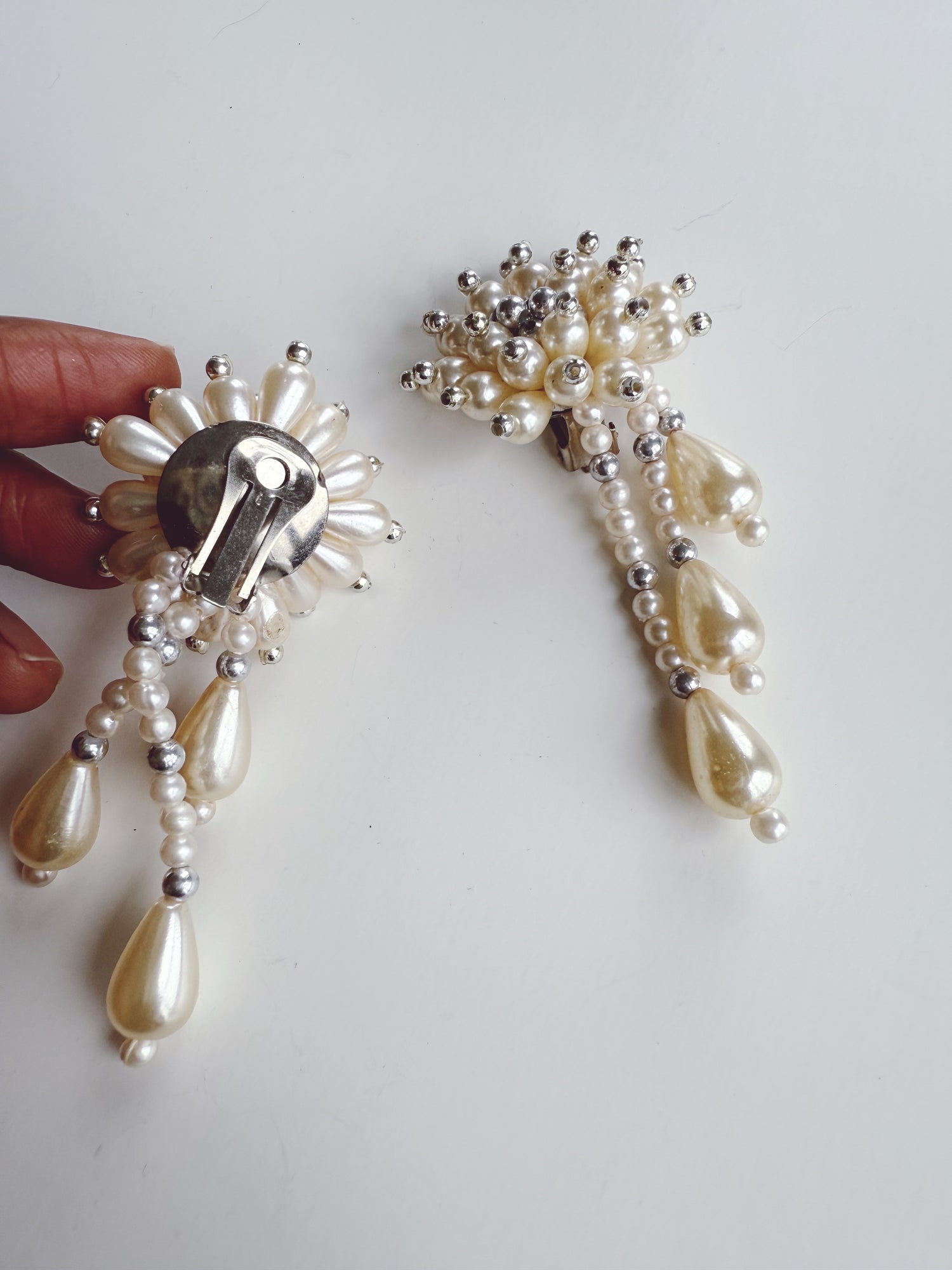 Vintage statement cluster pearl clip on earring. 3.5” long.