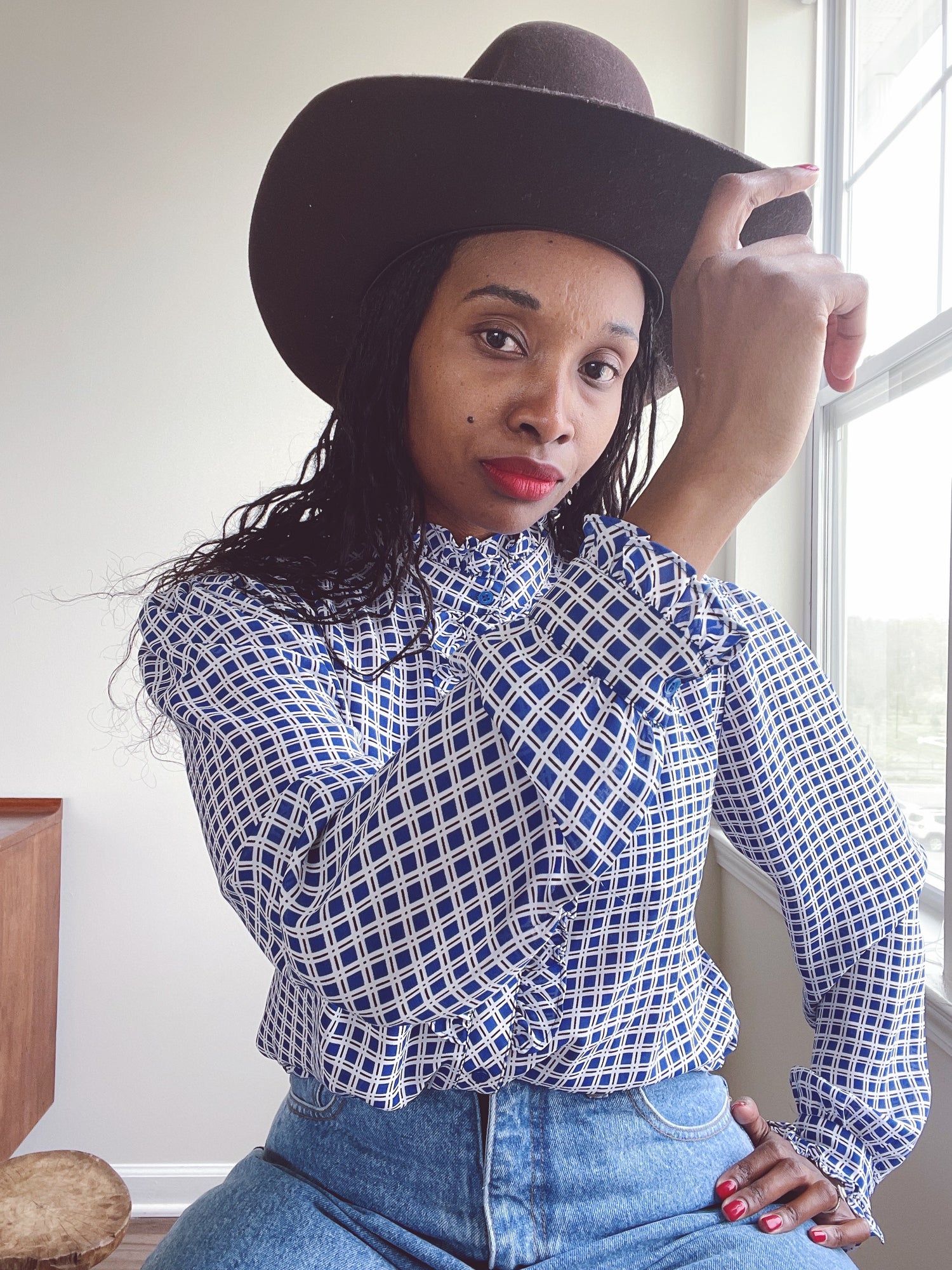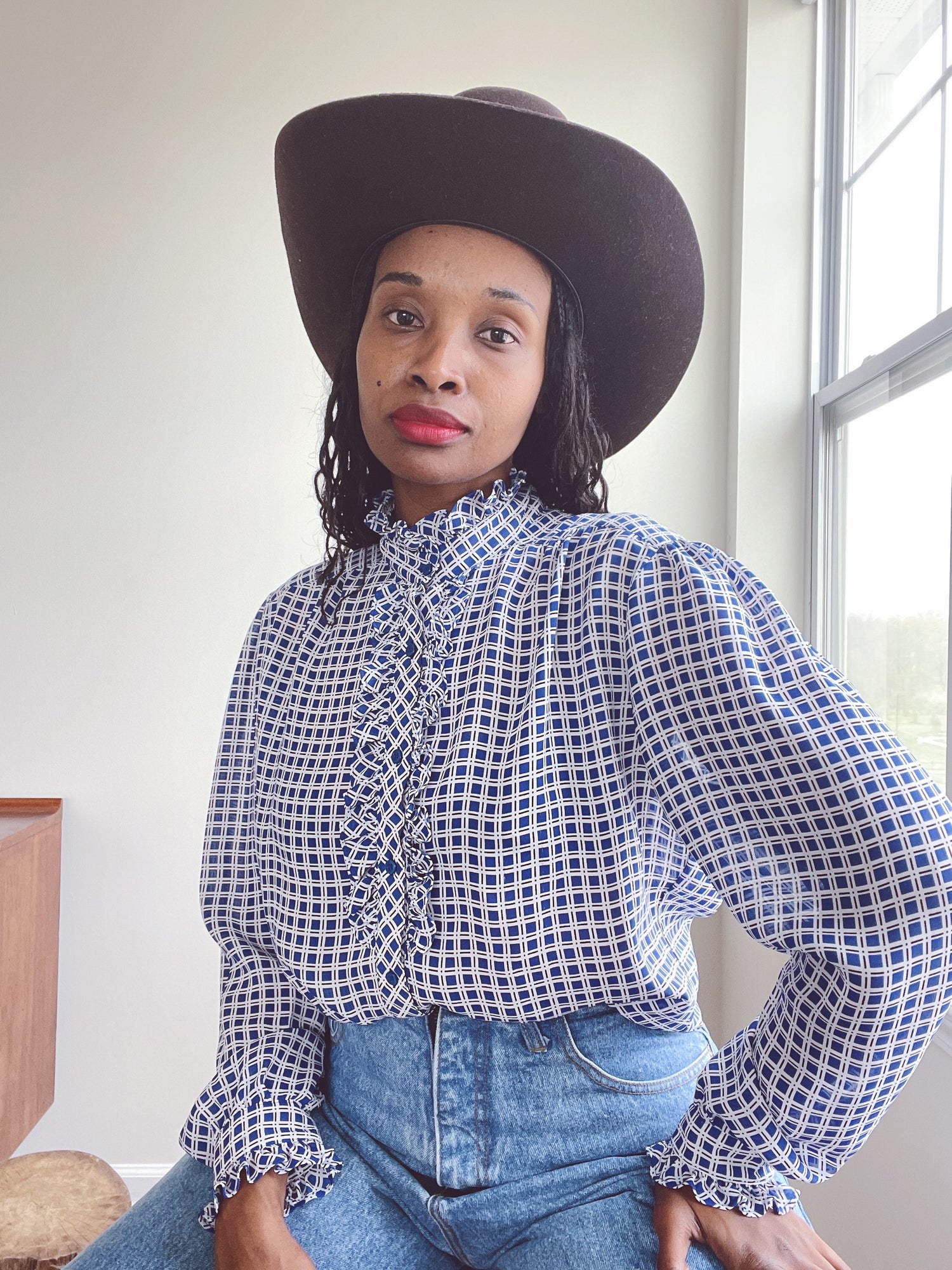 Vintage Ruffle Chiffon Blue Check Blouse