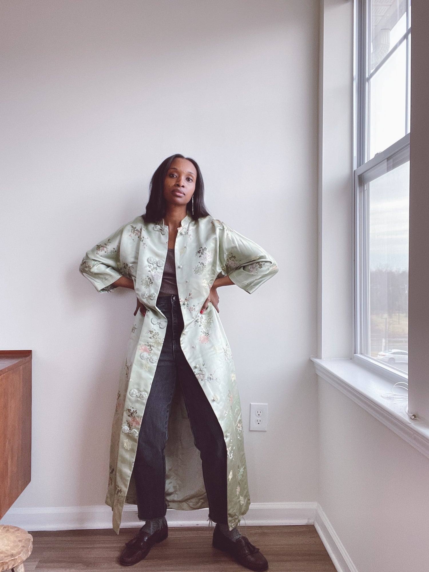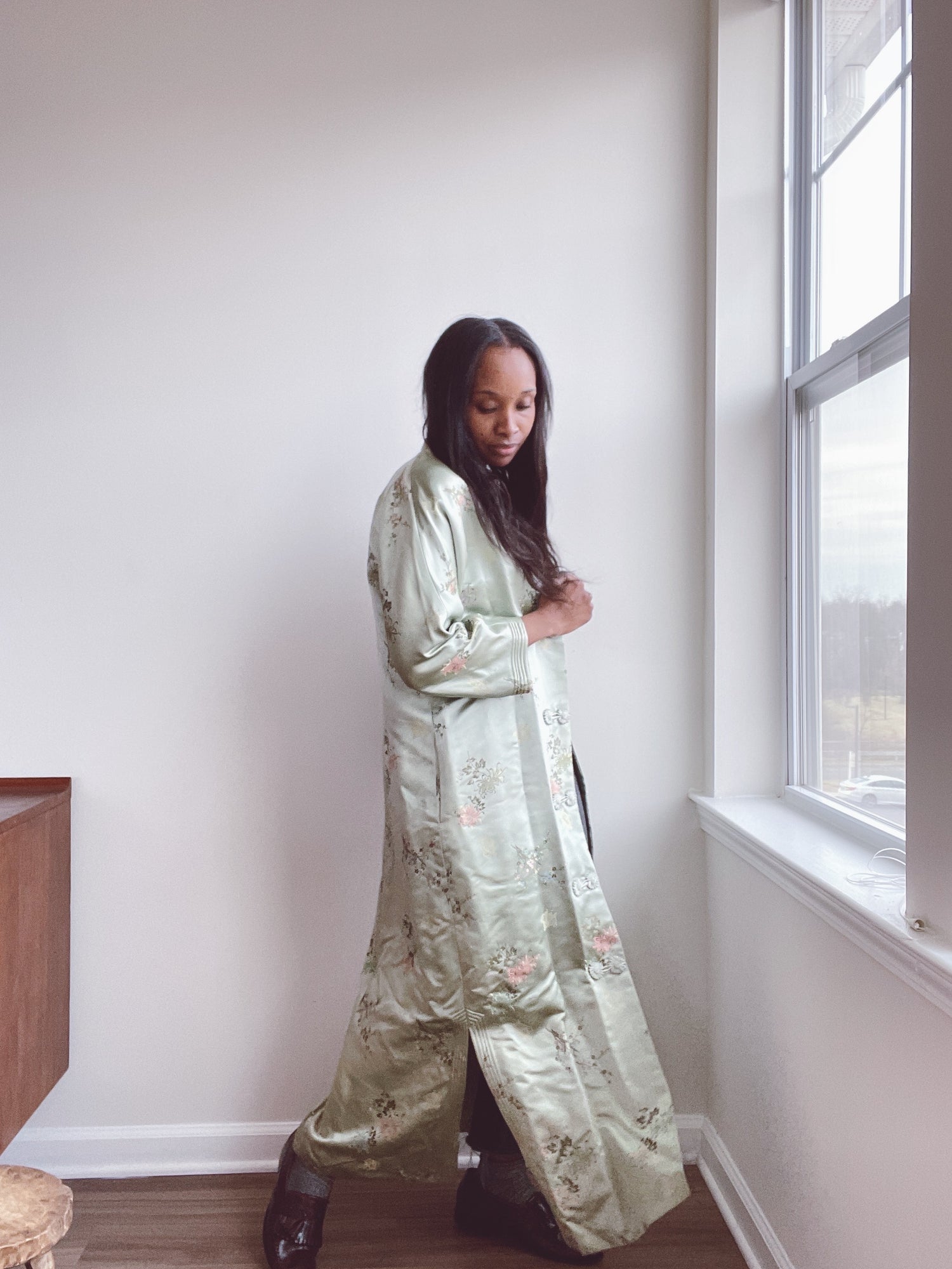 Asian 60s duster/dress. Buttons down the length so can be worn as a dress. Lovely shade of sage green. Condition is not perfect. It has some staining near right side.